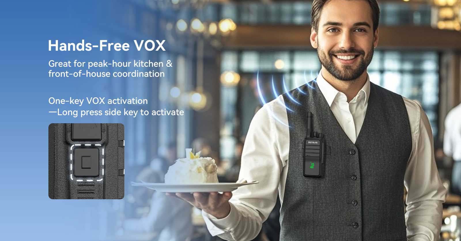 VOX elevates the communication experience from mechanical “push-to-talk” to intelligent “open-mouth-to-speak”. For work scenarios that require hands-free operation, then the VOX feature is revolutionary: