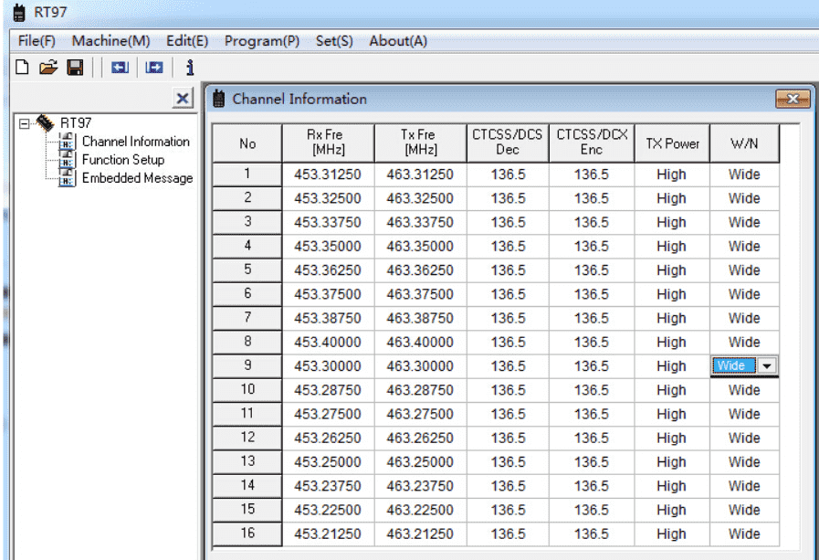 RT97: tx fre=463.31250 RX fre=453.31250 CTCSS/DCS: 136.5