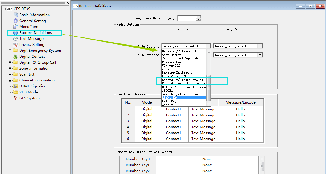 Choose “Button definitions”–set side key one or two open the recording function.Write data to your radio.