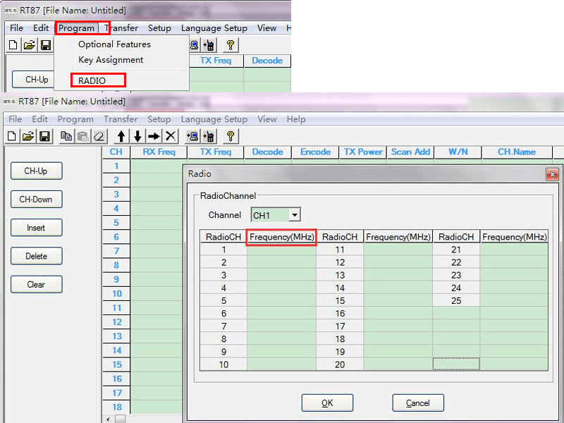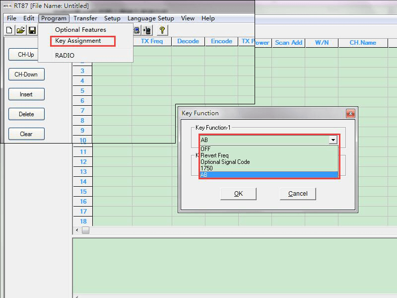 Open the software, select “Key Assignment” in the “program” option and you can select the function of the two side buttons (Including AB/1750/Revert Freq/Optional Signal Code/OFF)
