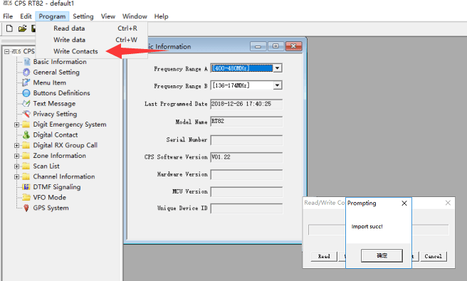 6. Improt DMR contacts csv file to the software, and then write to the radio.