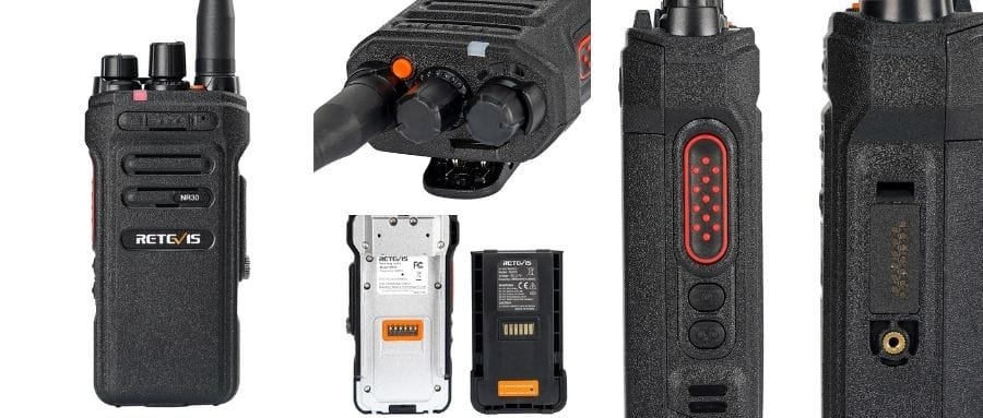 On the top of the radio, there are 2 knobs to switch the volume and channel. NR30 GMRS version with a fixed antenna but NR630 with a removable antenna, what’s more, there is a small orange button, it is the emergency button. On the left side, there are a PTT button and 2 function buttons, and the connector is on the right side.