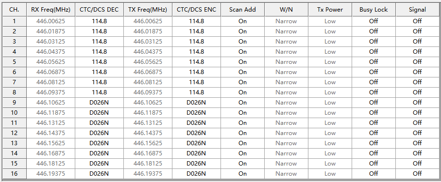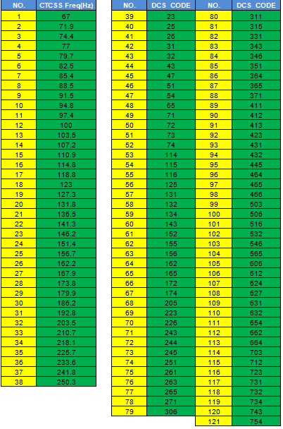From this, you can know that the 16th CTC/DCS of RT649P and the CTC/DCS of the first 8 channels of RT622 are the same; the CTC/DCS of the 41st CTC/DCS of RT649P and the CTC/DCS of the last 8 channels of RT622 are the same.