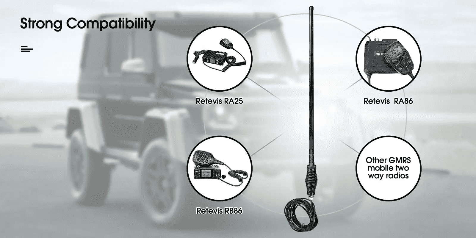 [3]. Strong Compatibility means that the antenna is designed to work with a wide range of mobile two-way radios and other related equipment, such as Retevis RA25, RB86, RA86, RT95, RT73, RA25, RT9000D,etc.