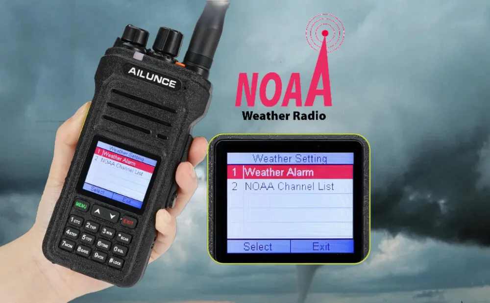 The NOAA function can receive essential safety information from the National Weather Service. HA1G GMRS two-way radio features 12 NOAA weather channels. You can find the NOAA settings on the menu of HA1G without PC software, and easily check the weather information on the screen.