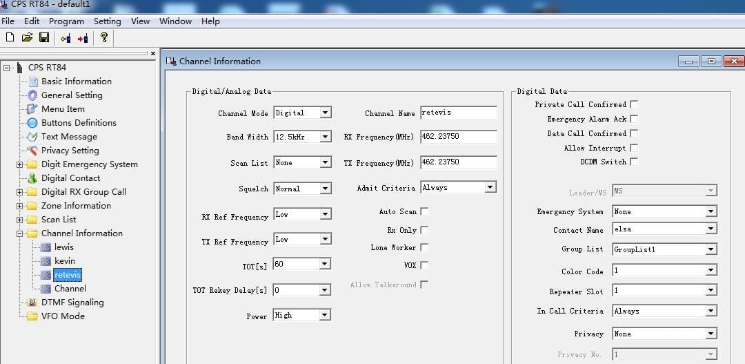 Menu–>Utilities–>Programm Radio–>Add Ch–>Digital–>Enter Ch name(like retevis)–RX frequency–TX frequency—Choose Contact–Add channel Saved.