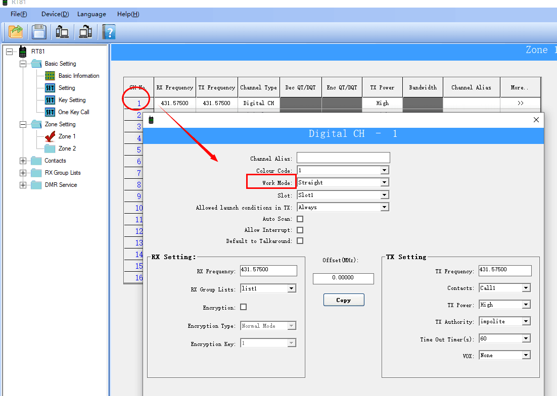 After install new RT81 software, pls programme the same frequency in digital mode, in addition, the work mode please choose ‘straight’