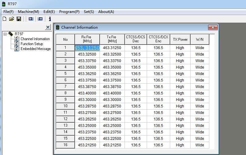 RT97 UHF(stock): RX: 453.31250Mhz, TX: 463.31250Mhz;