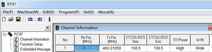 4.Programme the channal information, you need to set the transmit frequency of RT29 and the receive frequency of RT97 to be the same, and set the receive frequency of RT29 and the transmit frequency of RT97 to be the same